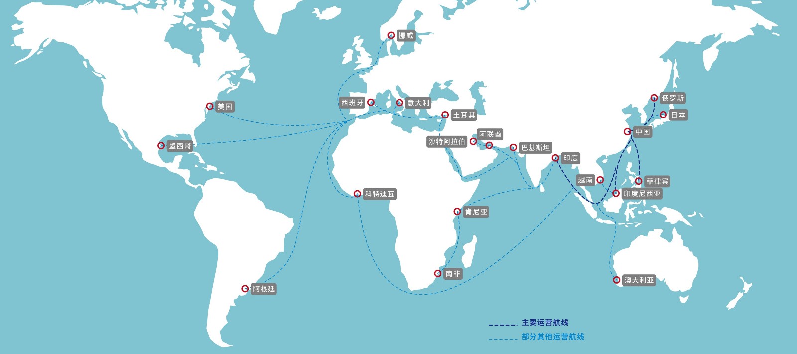 的境外航区运输业务,涉及全球远洋无限航区,包括世界各国家及地区的开放港口和国际通航运河及河流,运输货物以煤炭、矿石、粮食、件杂等干散货为主。